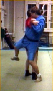 2- Maintenir toujours le bras d’attaque et coup de genou au bas-ventre